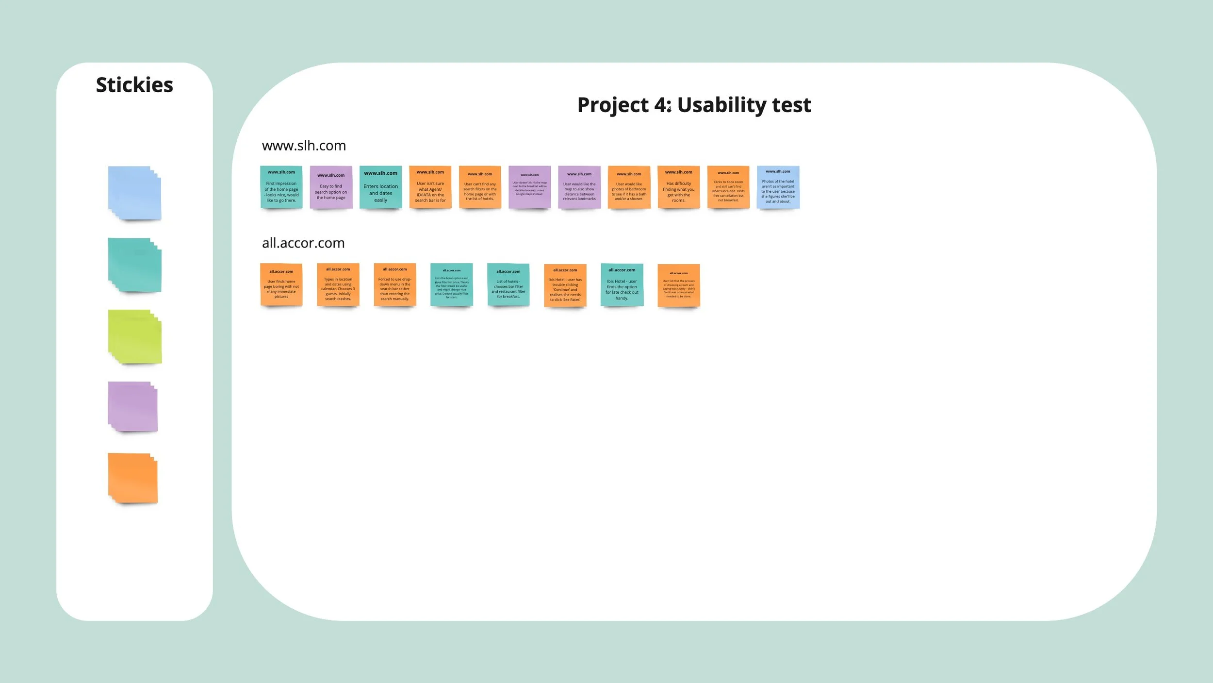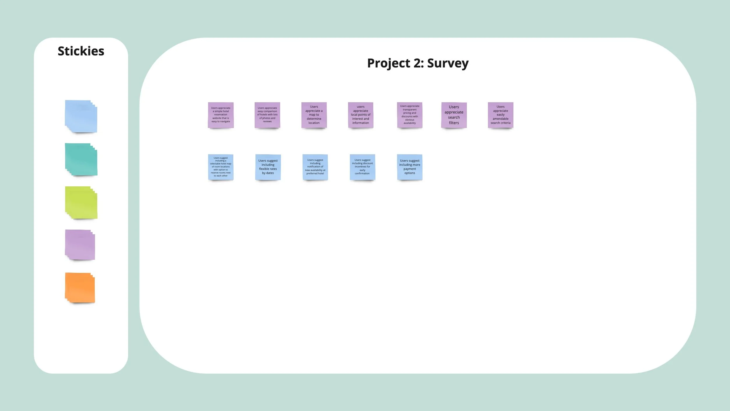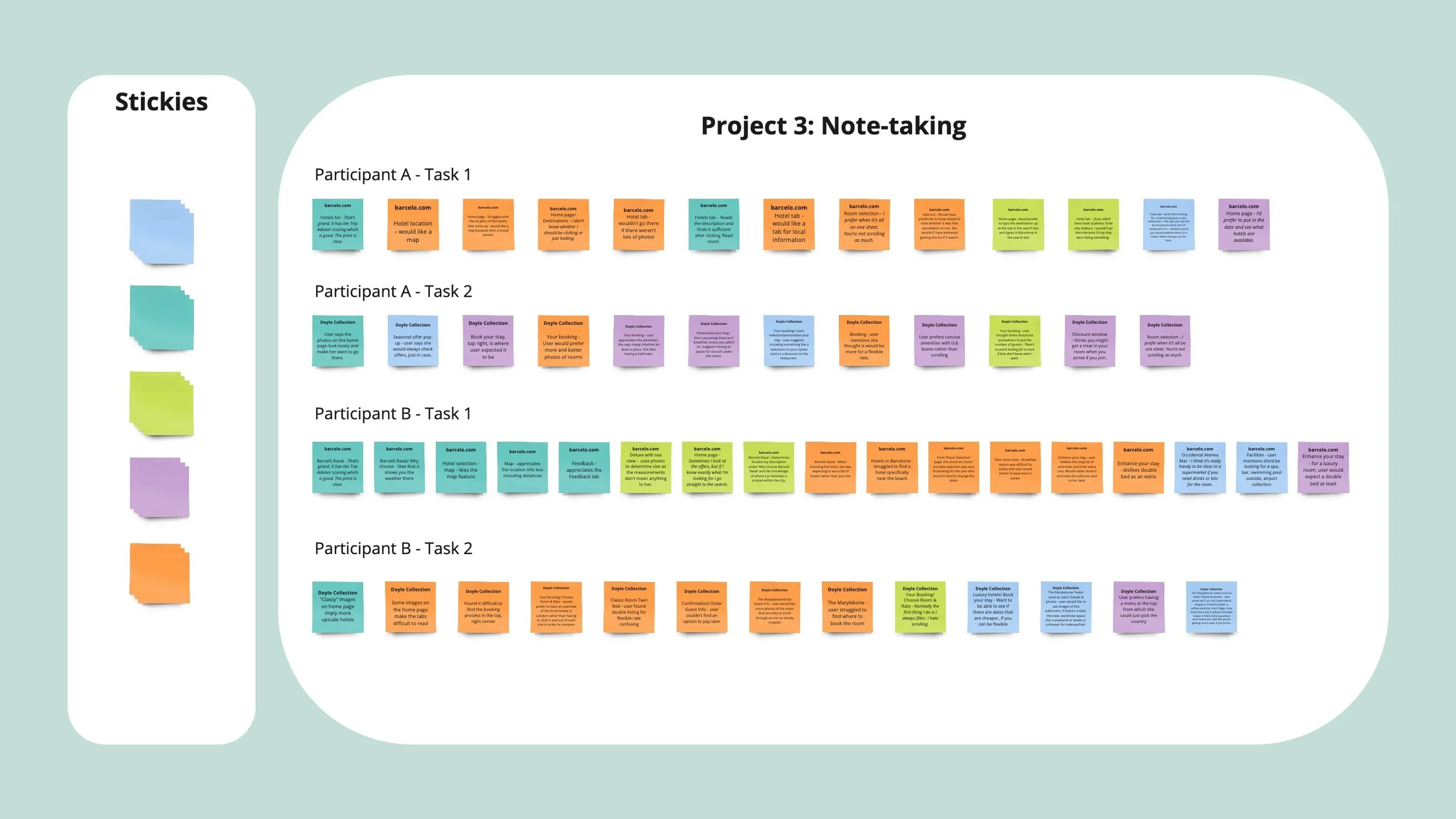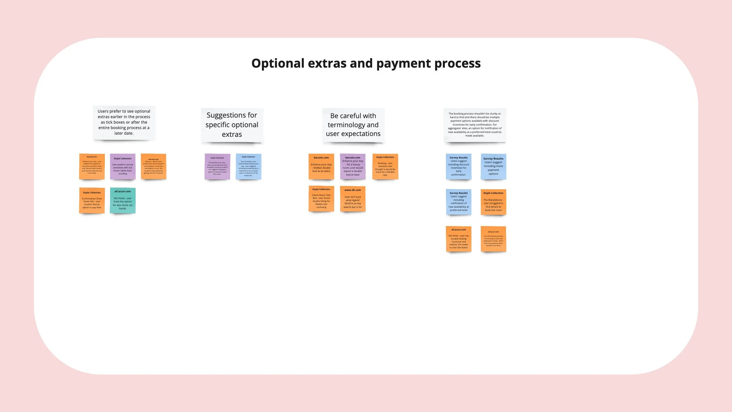 I conducted a card sorting exercise, gathering all the research notes on virtual post-its via Miro and organising them into categories to identify key themes emerging from the data.