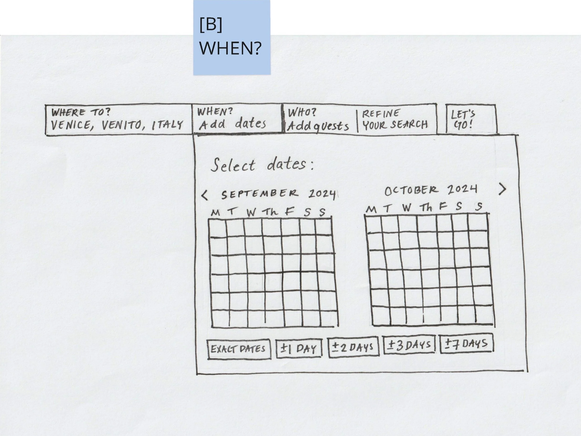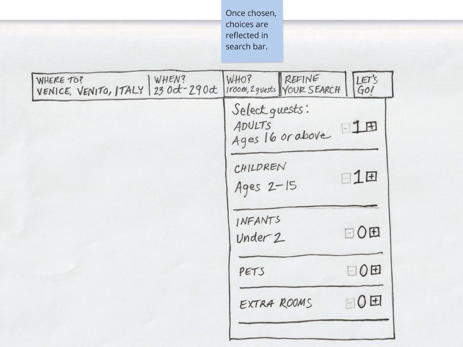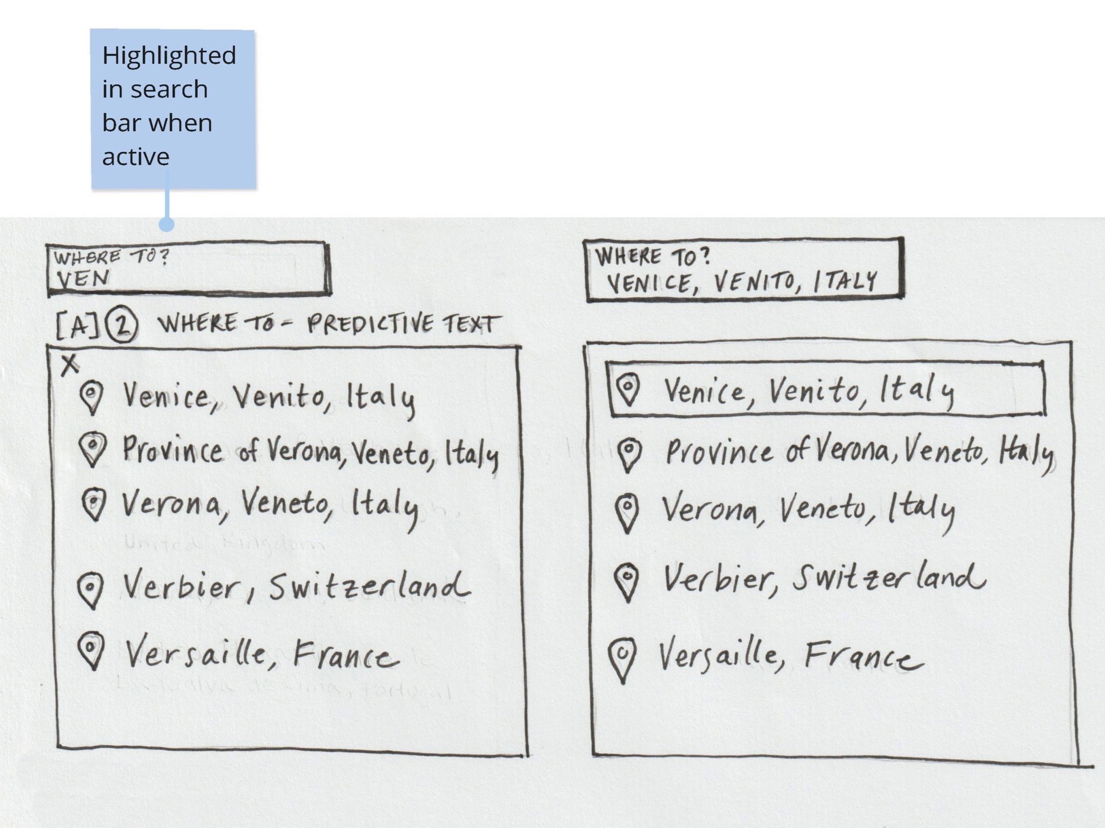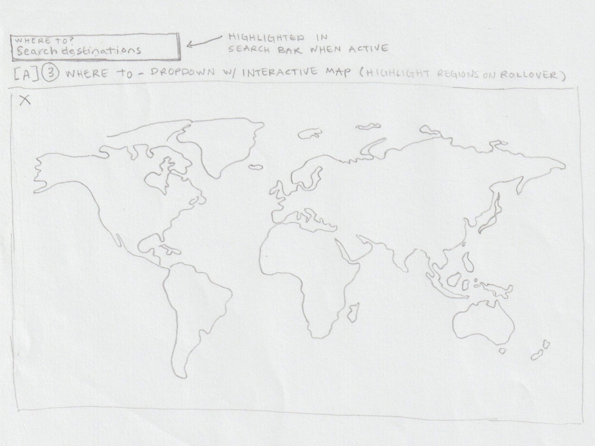 After establishing the user flow, I developed a series of interaction sketches to explore the layout, structure, and content hierarchy of each screen. In addition to predictive text for the “Where to” section of the search bar, I wanted to include a dropdown interactive map which highlighted regions on rollover, but for the prototype, I decided to focus on the primary user case when they knew where they wanted to go already.